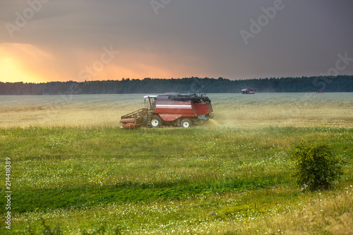 © hiv360, Fototapeta premium modern heavy harvester removes the ripe wheat bread in field before the storm. Seasonal agricultural work