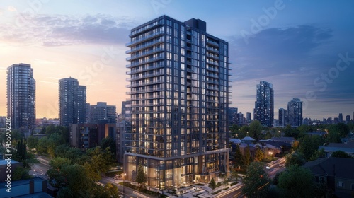 Obraz premium Modern high rise apartment building at dusk cityscape view
