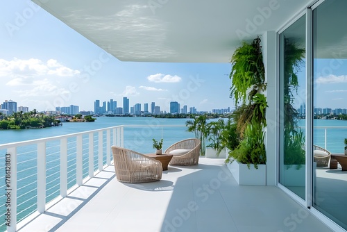 Naklejka premium Modern high rise balcony overlooking a vibrant city skyline and serene bay...