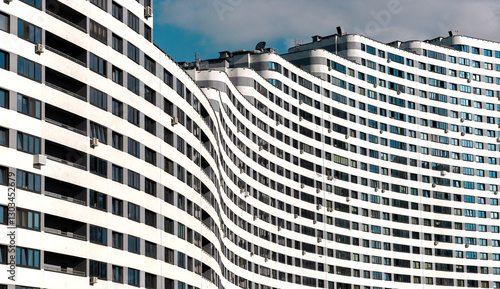 © valiantsin, Fototapeta premium Modern high-rise condominium with a wavy, curved shape in a metropolitan city. Unique architecture, geometric design, concrete facade, and windows. New residential development offering accommodation,
