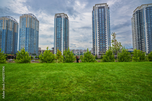 © dizfoto1973, Obraz premium Modern high-rise residential buildings stand tall behind a vibrant green lawn and lush trees under a cloudy sky, showcasing contemporary urban living with refreshing natural elements.