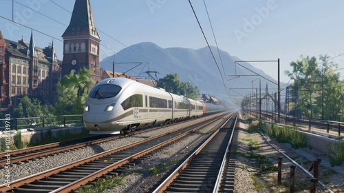 © Imsuniyah, Fototapeta premium Modern High-Speed Train Approaching Cityscape with Mountain View