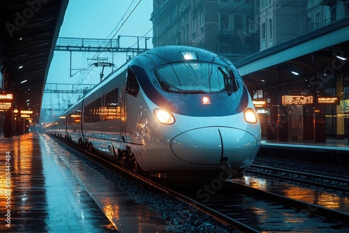 © Gatherina, Fototapeta premium Modern high speed train arriving at station during rain at dusk