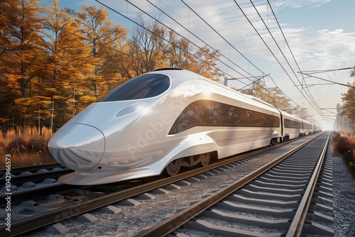 © Olegarx525, Naklejka premium Modern high-speed train in fast motion passes through railway stations