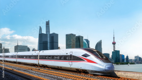 Fototapeta premium Modern High-Speed Train in Shanghai's Urban Landscape