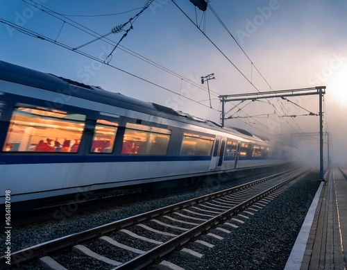 © Raymond, Fototapeta premium modern high speed train leaving station in the fog at dusk