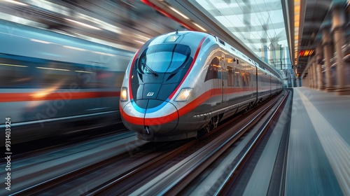 Fototapeta premium Modern High-Speed Train Moving at High Velocity Through a Train Station