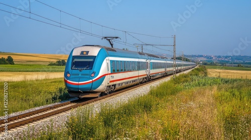 Naklejka premium Modern high-speed train on an elevated track, sleek design and open landscape...