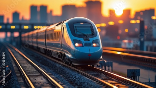 © Fristy, Naklejka premium Modern high speed train on railway tracks during sunset with city skyline
