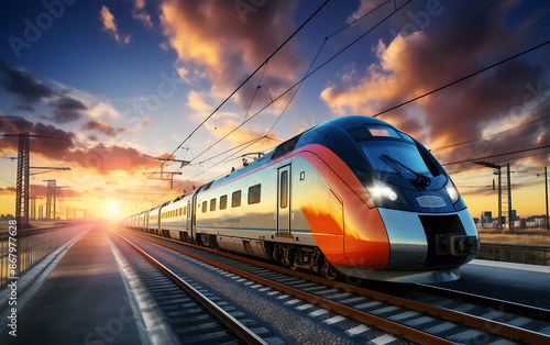 © Creative Laik, Fototapeta premium Modern high-speed train on the background of a beautiful sunset.