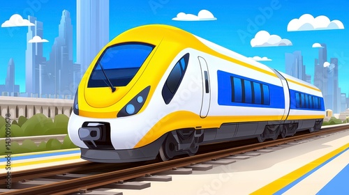© Moree, Fototapeta premium Modern High-Speed Train on Tracks Against a Bright Cityscape with Blue Skies and Clouds