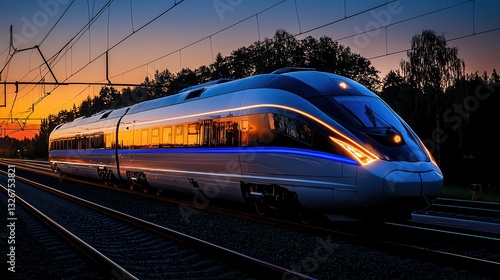 © FarhaStock, Naklejka premium Modern High-Speed Train on Tracks During Sunset with Vibrant Sky Colors