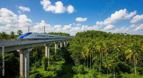 Obraz premium Modern High Speed Train Travels Through Lush Tropical Landscape
