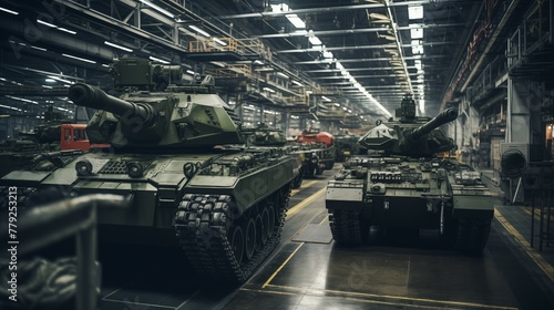 Fototapeta premium Modern high tech factory producing military tank vehicles in a production line