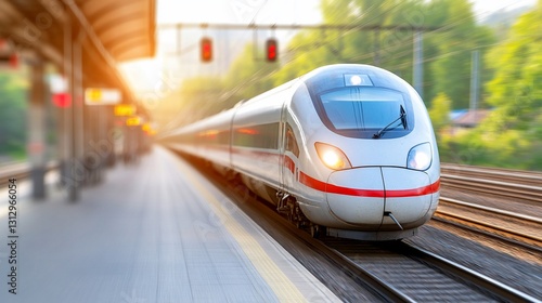 Fototapeta premium Modern HighSpeed Train Arriving City Station Sunrise Travel Transportation