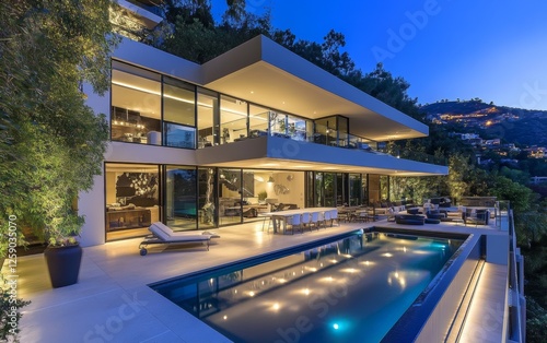 © MySamLobatobrock, Fototapeta premium Modern hillside villa, twilight pool, ocean view, luxury real estate