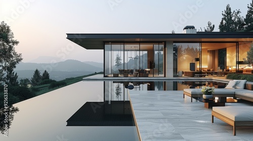 Fototapeta premium Modern hillside villa with infinity pool at sunset, featuring sleek architecture and panoramic mountain views