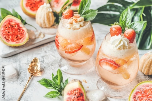 © Anna, Obraz premium Modern Holi Celebration Setup With Gujiya and Colorful Fruit Mocktails on a Minimalist Table