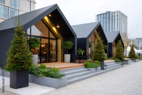 © kardaska, Obraz premium Modern holiday market stalls displaying festive Christmas trees