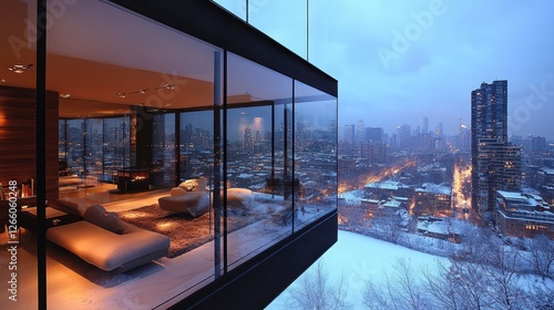 Obraz premium Modern home boasts a captivating view of the cityscape during winter