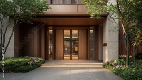 Fototapeta premium Modern Home Entrance with Wooden Doors and Stone Walls