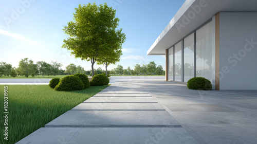 © Gun, Naklejka premium Modern Home Exterior with Concrete Pathway Surrounded by Trimmed Grass and Lush Greenery Under Clear Blue Sky