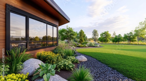 Naklejka premium Modern home exterior with lush garden, vibrant flower, and scenic landscape...