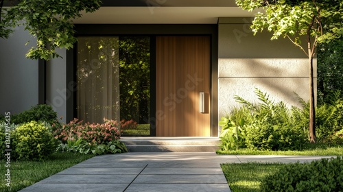 © max79im, Naklejka premium Modern home facade with entrance, front door and view to the garden