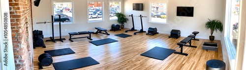 Naklejka premium Modern Home Gym Interior With Wooden Floor and Exercise Equipment.