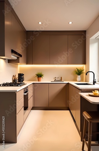 © Ana River, Fototapeta premium Modern home kitchen in trendy color 2025 mocha mousse. Elegant and cozy kitchen design.