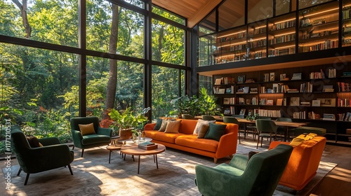 Naklejka premium Modern home library with forest view, ideal for relaxation or study