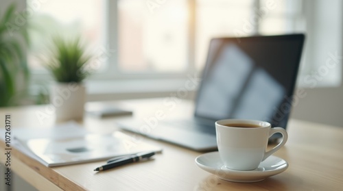 © Cloudy, Obraz premium Modern Home Office Desk with Laptop, Coffee, and Plant
