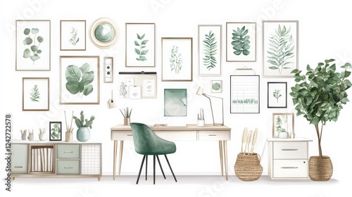 © Farah, Fototapeta premium Modern home office featuring a stylish desk, green decor, and botanical wall art in a bright setting