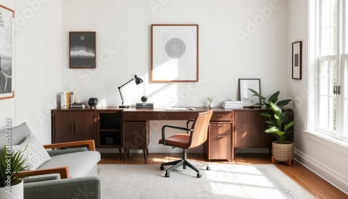 © Kitta Studio, Fototapeta premium Modern Home Office Interior Design with Wooden Furniture and Plants