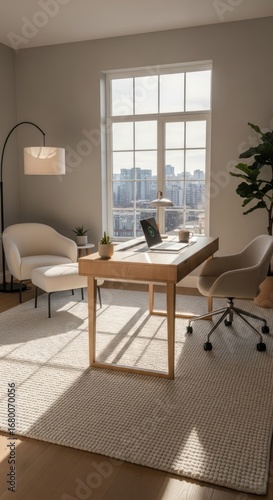 Obraz premium Modern Home Office Interior with Natural Light, City View, Wooden Desk, and Cozy Seating Area
