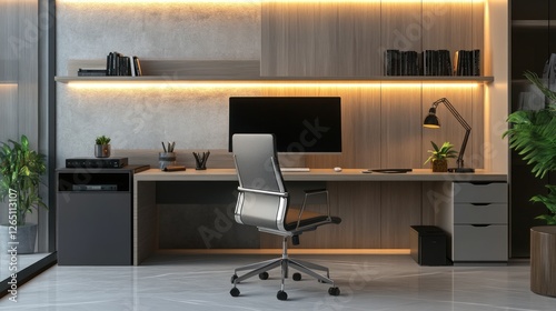 Fototapeta premium Modern Home Office Setup with Sleek Desk and Comfortable Ergonomic Chair