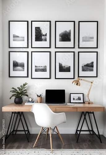 © Teeranan, Fototapeta premium Modern Home Office with Black and White Landscape Prints