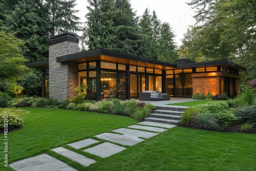 © ardanz, Fototapeta premium Modern home surrounded by lush greenery and landscaping.