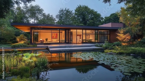 Fototapeta premium Modern home with a pond in the backyard. This image can be used for real estate, architecture, and interior design websites.