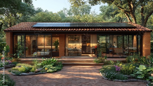 © arsyi_06, Naklejka premium Modern home with solar panels and a garden.