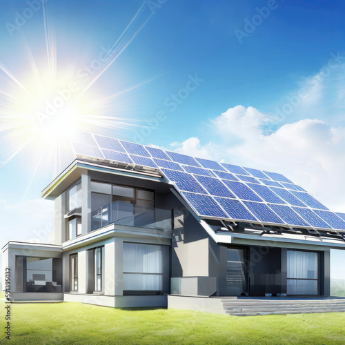 Naklejka premium Modern home with solar panels on the roof under a bright sky, generative AI