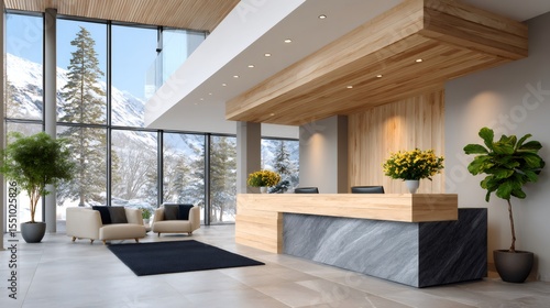 Fototapeta premium Modern hotel lobby overlooking snowy mountains with reception desk