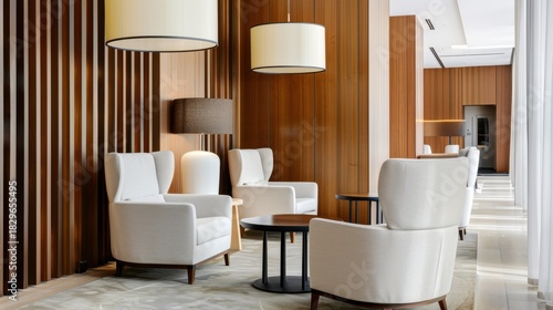 Fototapeta premium Modern Hotel Lounge with Minimalist Design and Elegant Furnishings in Warm...