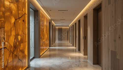 © Nata, Fototapeta premium Modern hotel with amber resin panels and natural wood walls