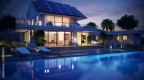 © Iarte, Obraz premium Modern house and swimming pool with solar energy