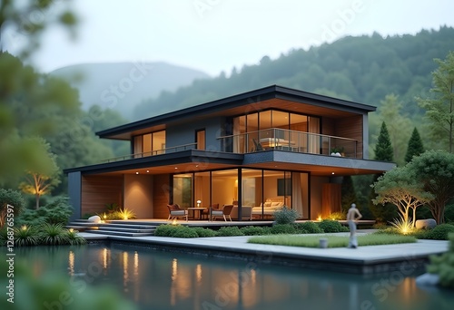 © Mahmudul, Obraz premium modern house at the lake, moody mountain forest background, water reflection, 3d render, 3d illustration