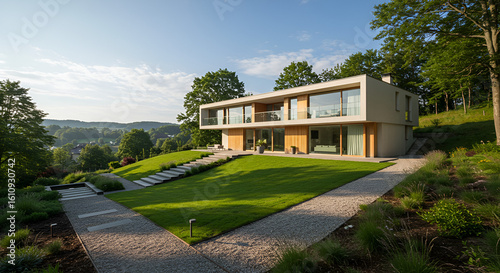 Naklejka premium Modern house atop grassy hill scenic views