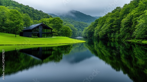 Fototapeta premium Modern house by tranquil lake, mountain backdrop, serene landscape, ideal for...