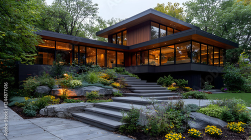 Naklejka premium Modern house, evening light, landscaped yard, suburban setting, real estate
