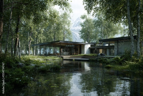 Fototapeta premium Modern House Exterior Nestled In Lush Forest With Pond Reflection
